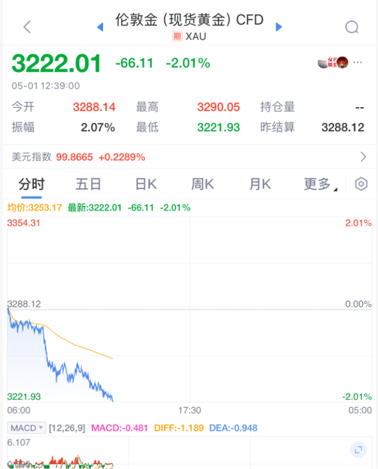 5月1日,现货黄金继续走低,向下跌破3230美元/盎司,日内跌超2%。